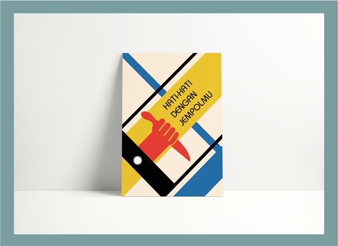 "Hati-hati dengan jempolmu" (literal translation: be careful with your thumbs) is an idiom in Indonesia. It means to choose words carefully when commenting or creating a status. This is a bauhaus style poster. Bauhaus is identical to geometric and primary colors. In accordance with the theme given, I made a hand that showed thumb and seemed to be holding a knife in a cellphone. Here, I illustrate that our fingers can do something wrong even though we think that what we're doing is right, so it can endanger others and even ourselves. For example, cyberbullying. People often just type and then post without thinking first, assuming that what they do is just a joke without thinking about what is considered a joke turns out to be an insult to other people. As a result, some have become depressed and even decide to end their life; like a knife in hand, ready to kill anyone because of an unconscious negligence.